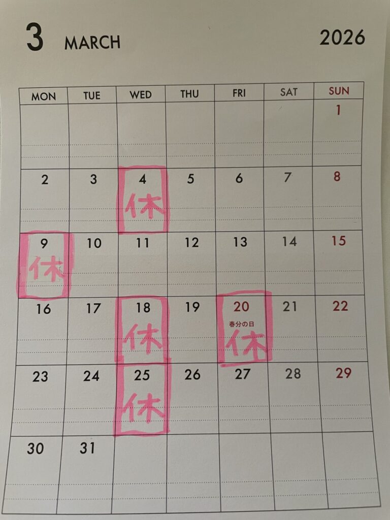 2026年3月のお休み。