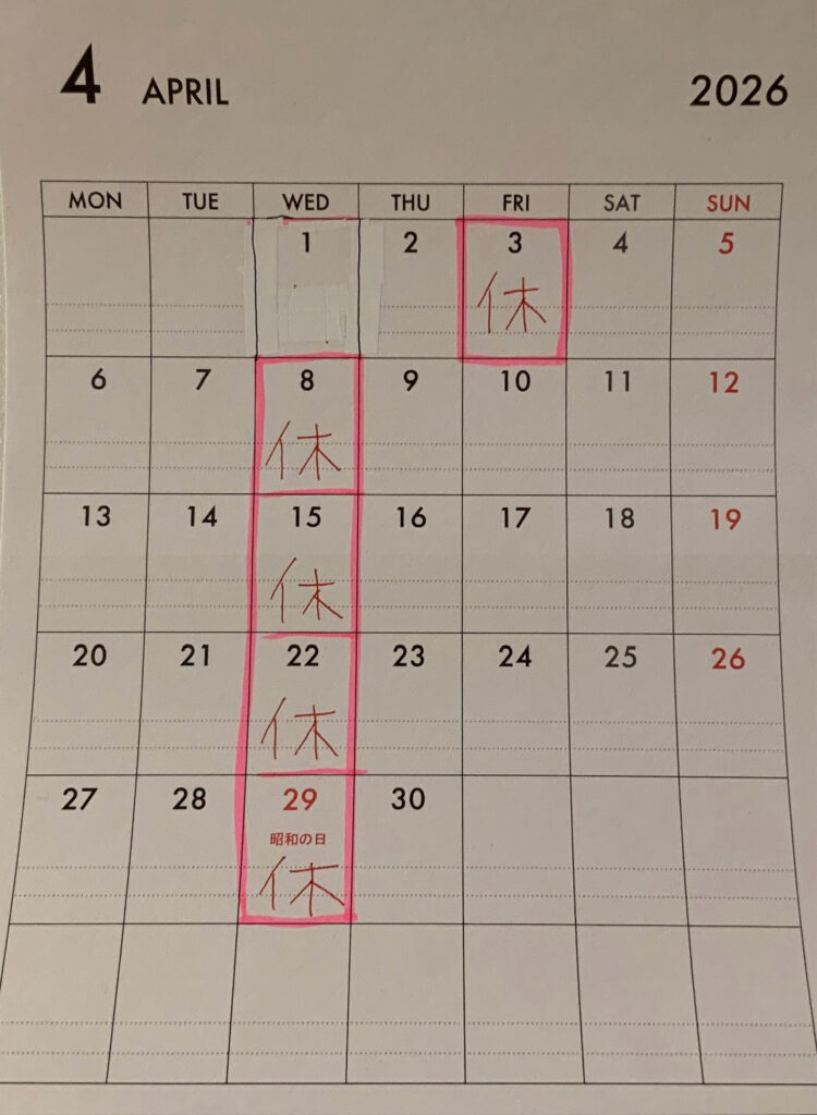 2026年4月のお休み。